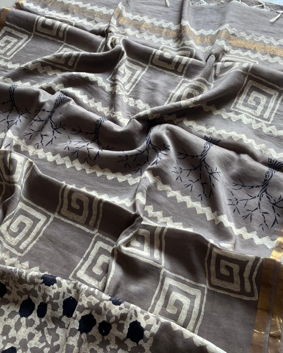 Chanderi Hand Block Ajarakh Print Saree is a natural crafted with care by skilled artisans. Known for their lightweight texture and luxurious sheen, elegant collection, these sarees are natural dyed, hence they are not as bright as seen in the pictures.