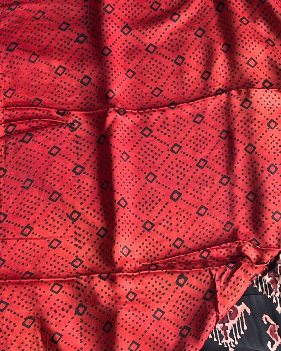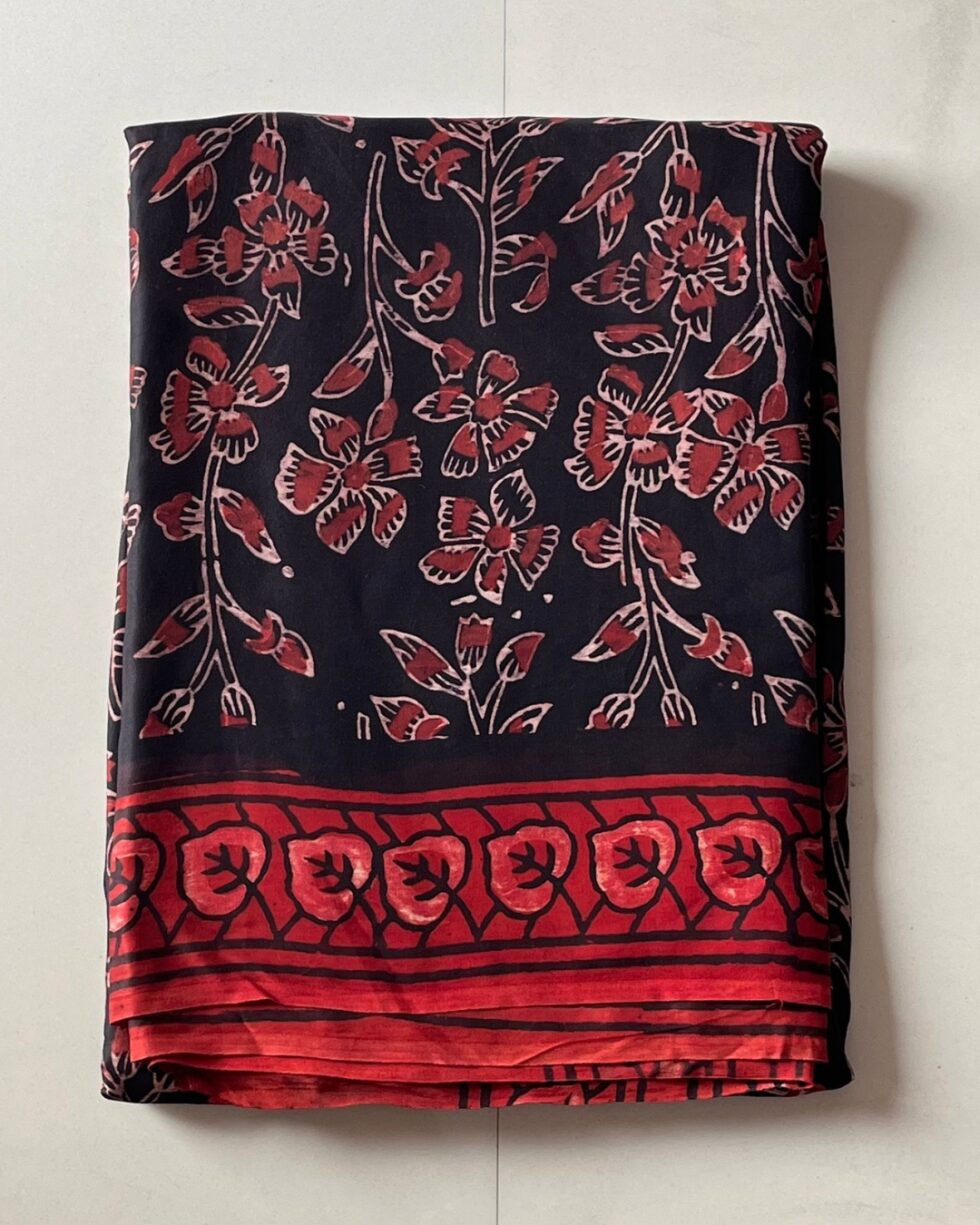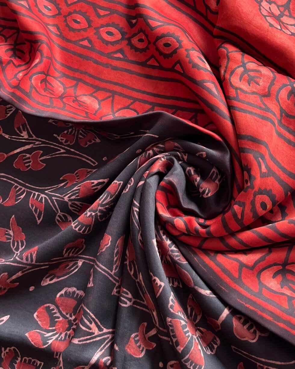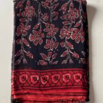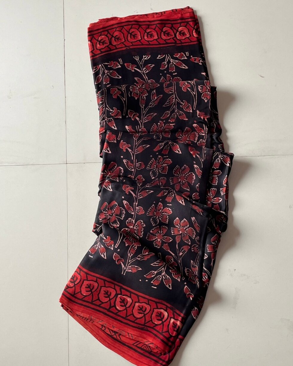 Description – Pure Modal Silk Fabric for unparalleled comfort and drape, handblock printed using traditional Bagru and Ajarakh techniques, vegetable dye colours are being used in all sarees for a sustainable and eco-friendly approach, these sarees are perfect for special occasions, weddings and festivals.