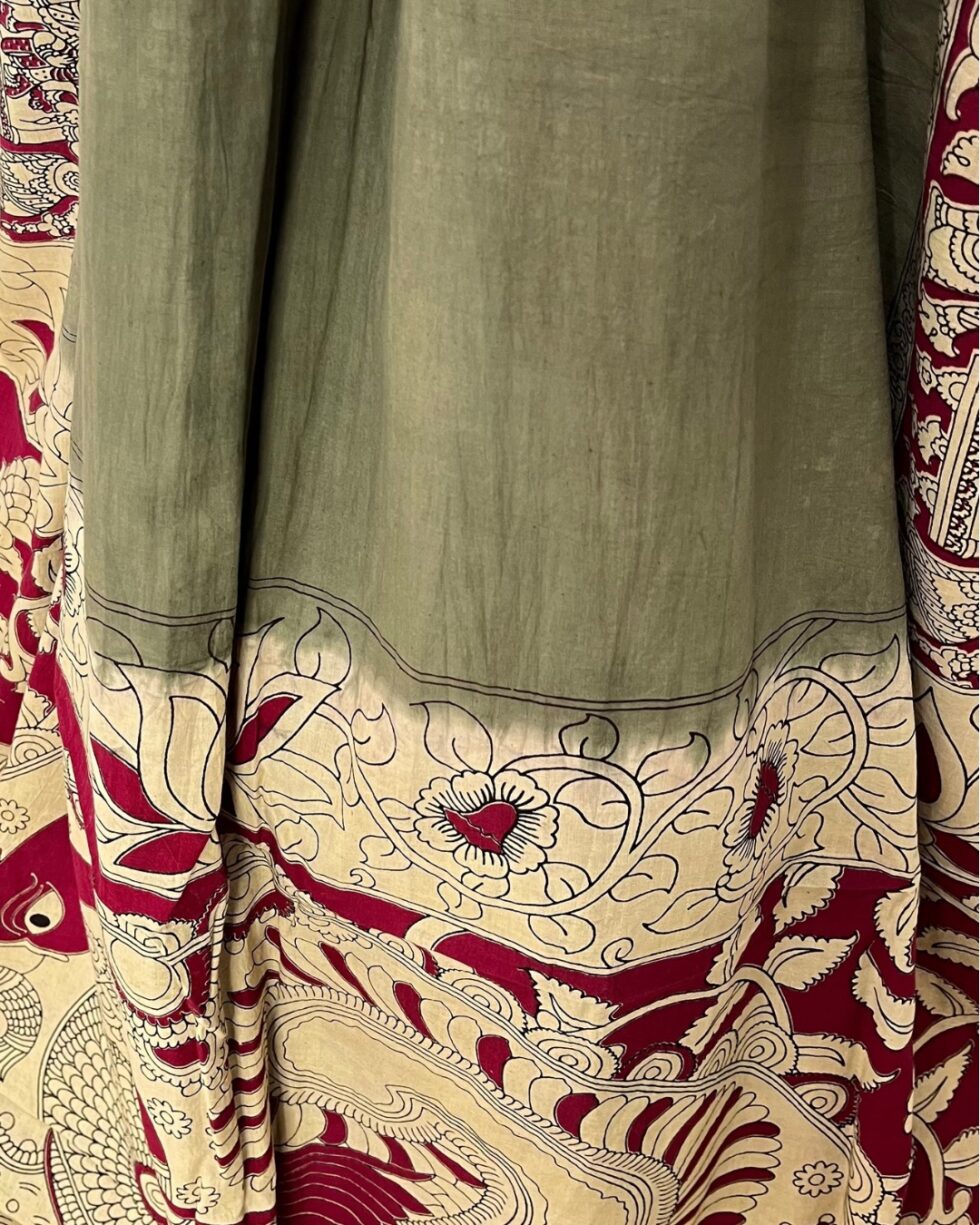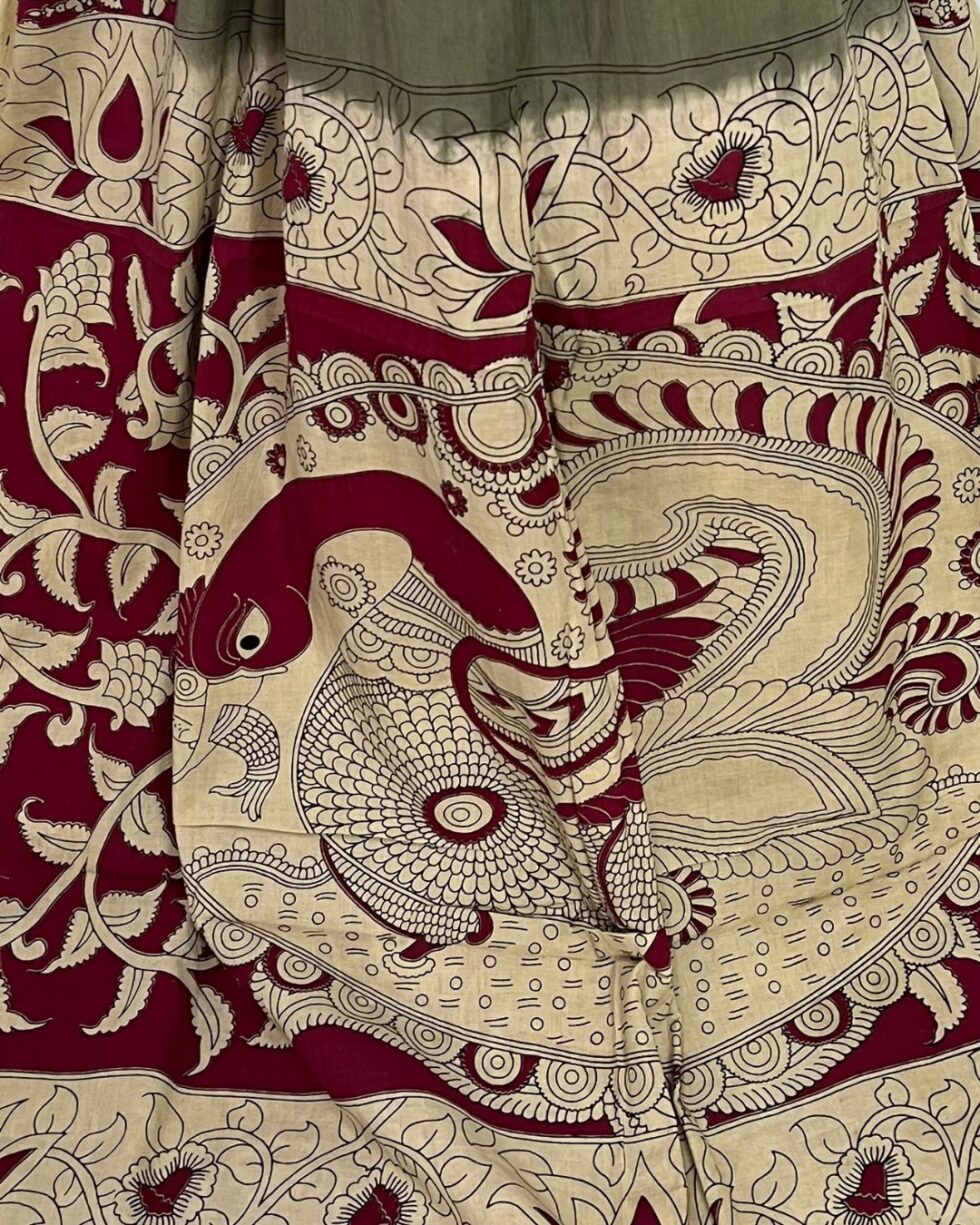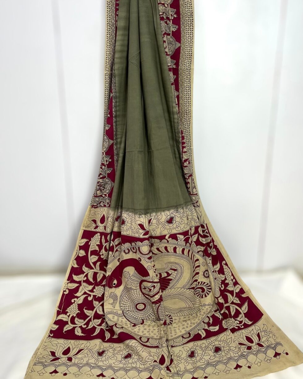 Description-The saree features an intricate hand-block printed design using the ancient Kalamkari technique, which involves printing with hand-carved wooden blocks to create unique and intricate patterns.
