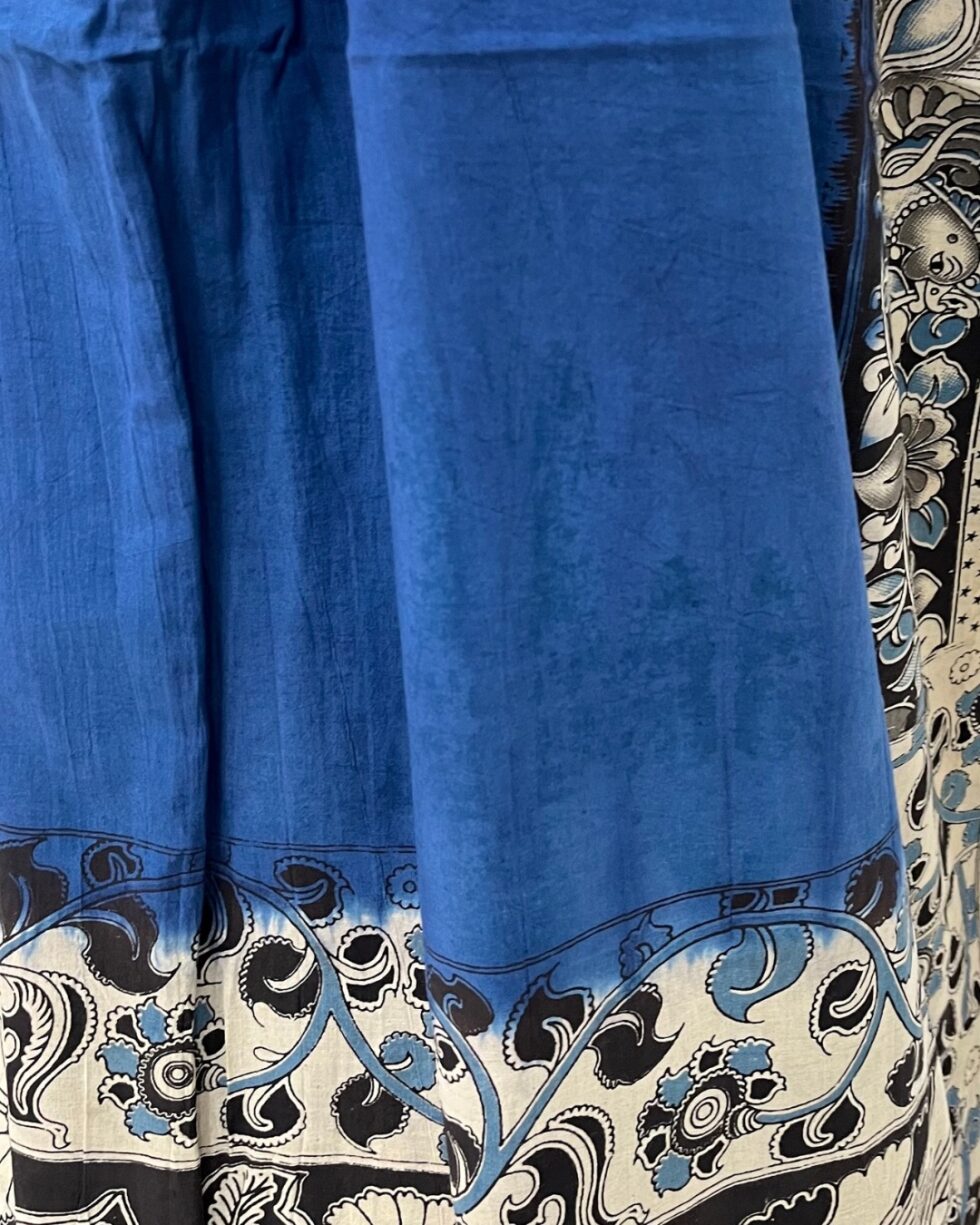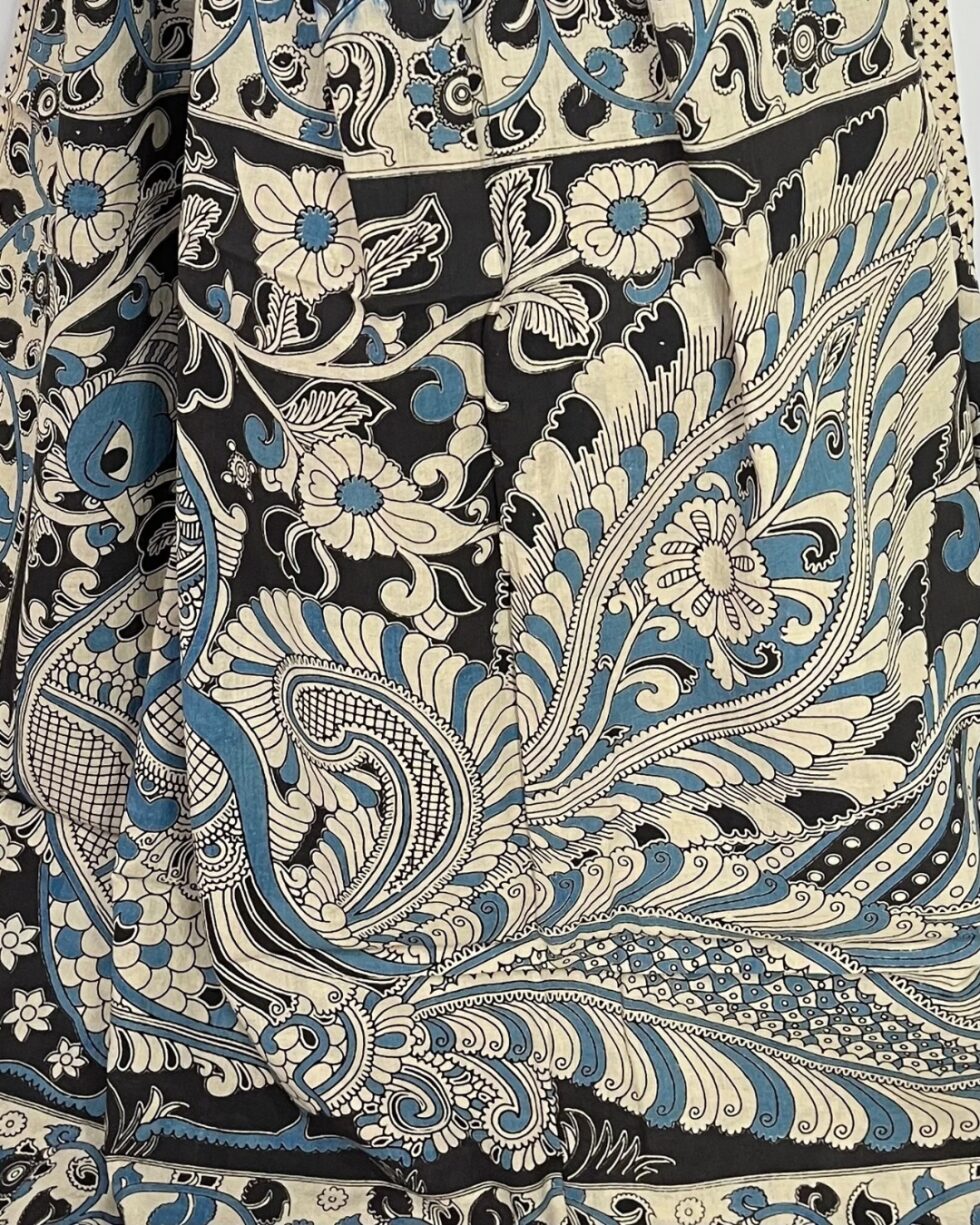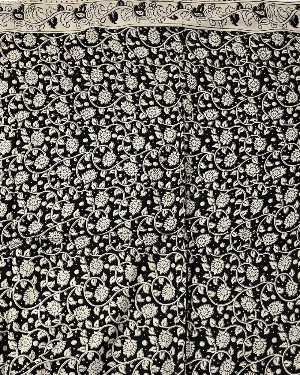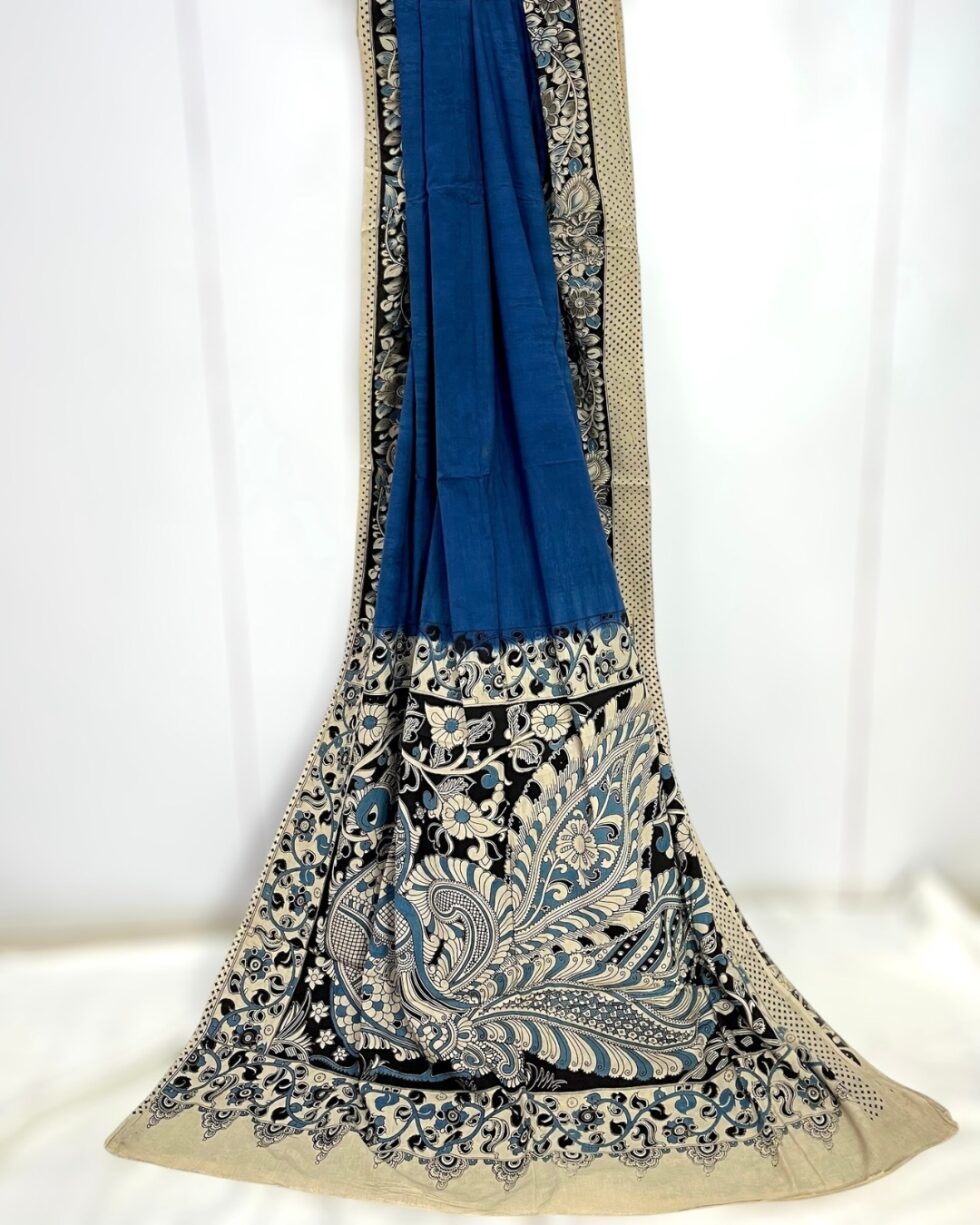 Description-The saree features an intricate hand-block printed design using the ancient Kalamkari technique, which involves printing with hand-carved wooden blocks to create unique and intricate patterns.
