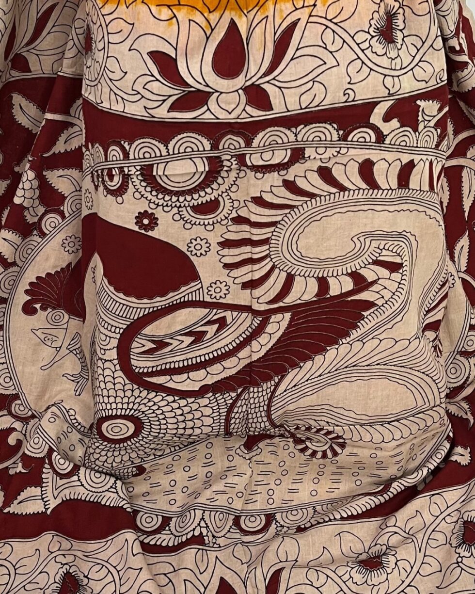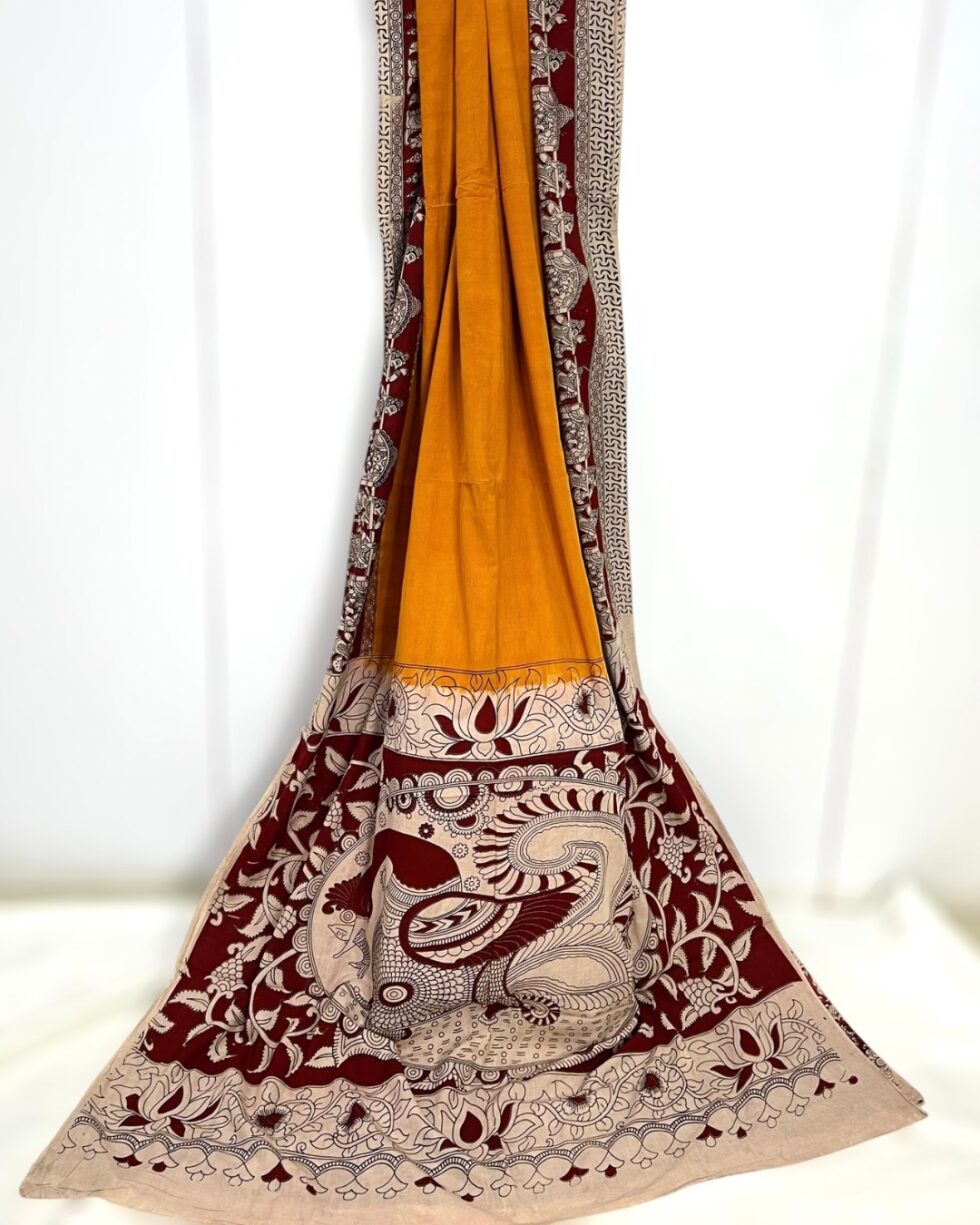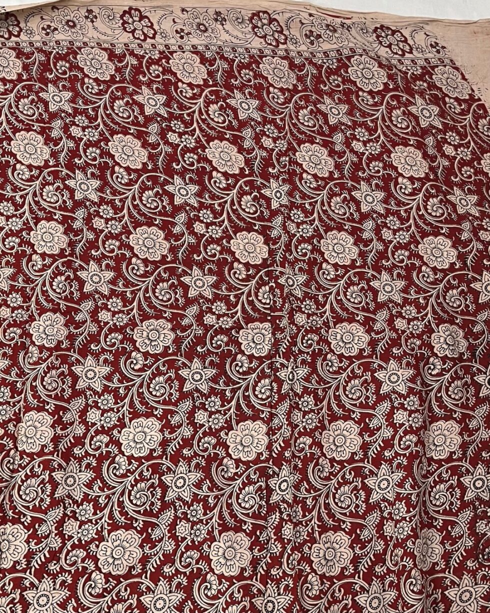 Description-The saree features an intricate hand-block printed design using the ancient Kalamkari technique, which involves printing with hand-carved wooden blocks to create unique and intricate patterns.