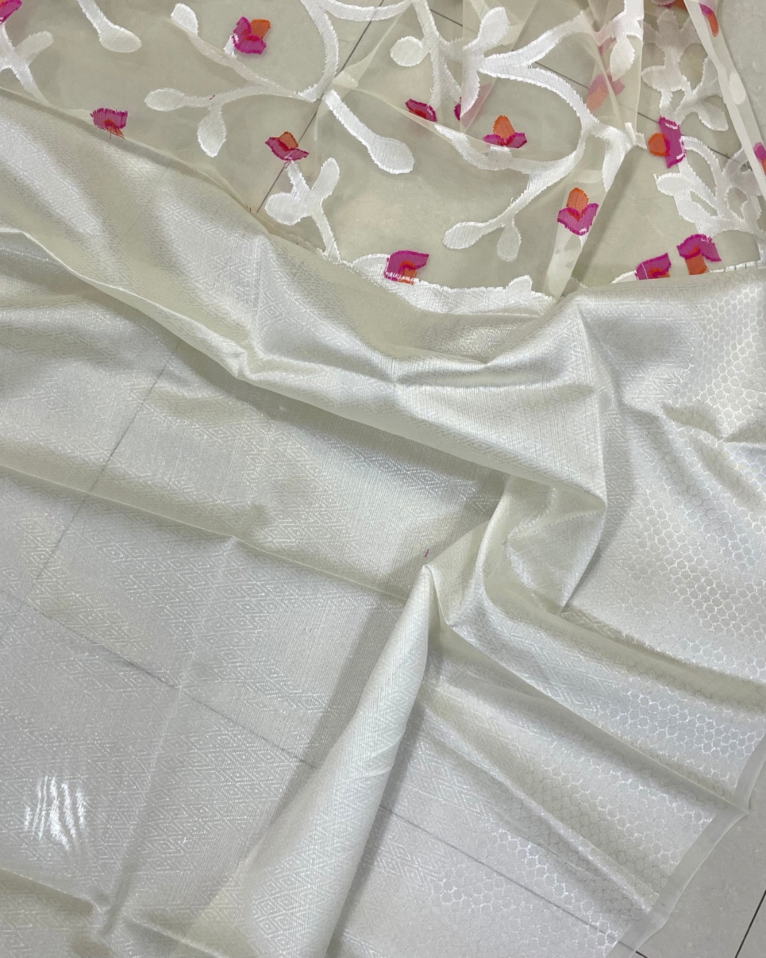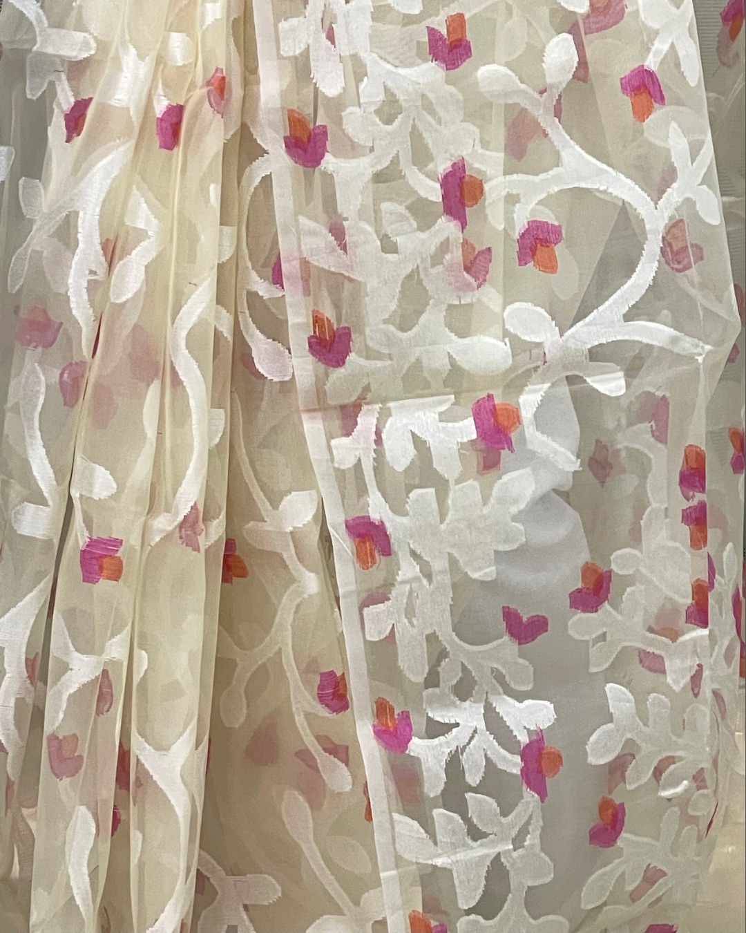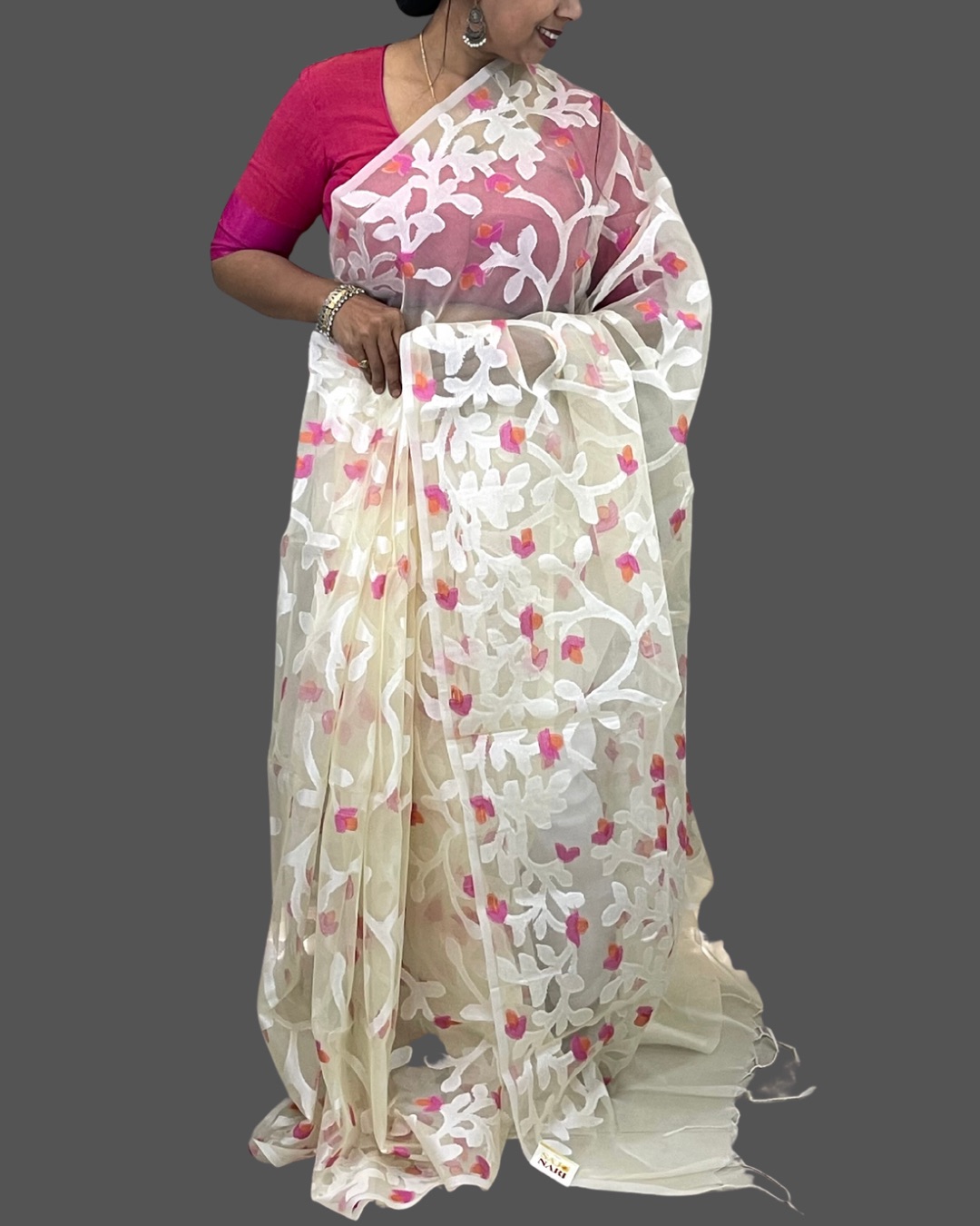 Muslin Jamdani Saree-Drifting seamlessly between tradition and modernity, Muslin Jamdani sarees accentuate the beauty of every woman. Whether it’s an intimate family gathering or a grand celebration, these sarees effortlessly reflect your elegance and poise.